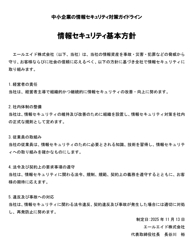 エールエイド株式会社(以下、当社)は、当社の情報資産を事故・災害・犯罪などの脅威から守り、お客様ならびに社会の信頼に応えるべく、以下の方針に基づき全社で情報セキュリティに取り組みます。